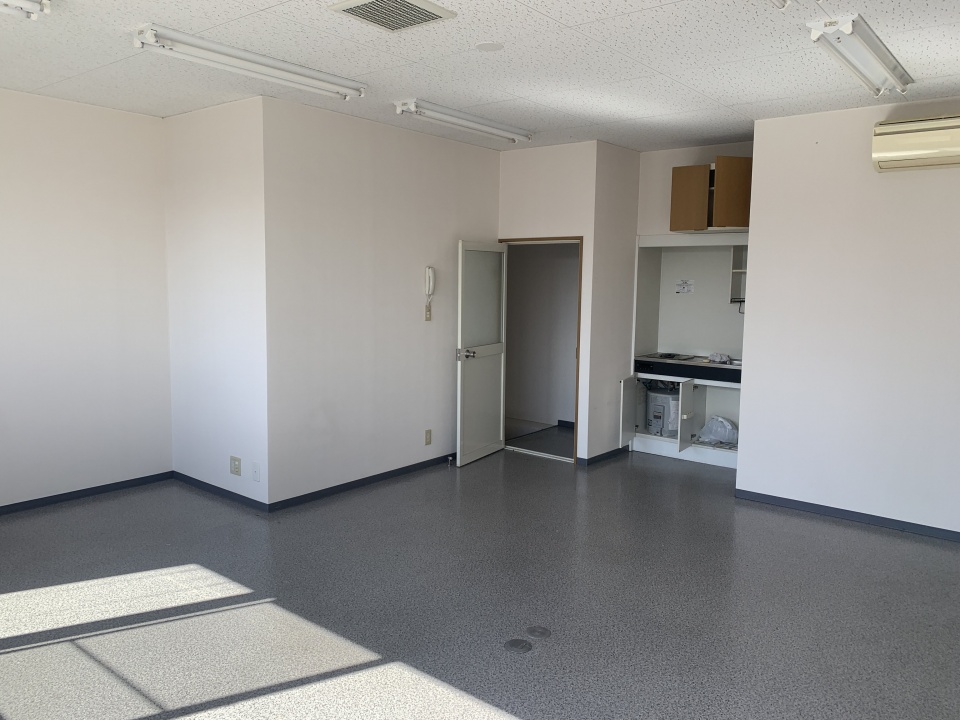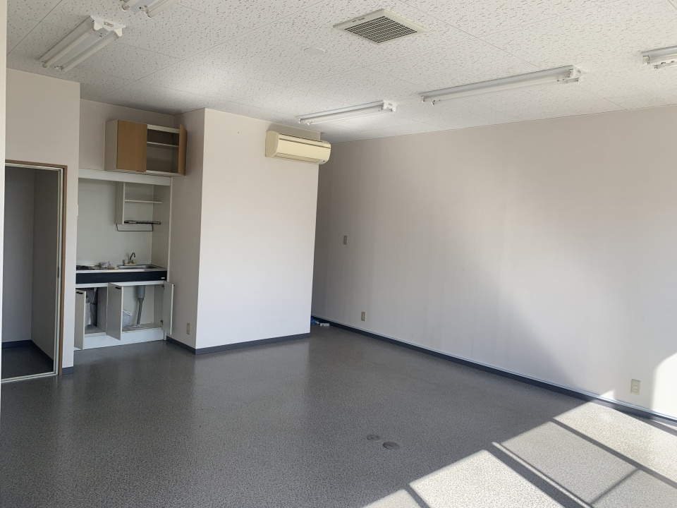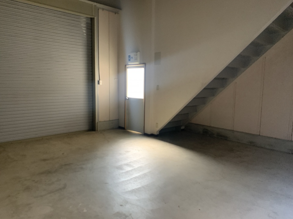- 1F:電動シャッター 倉庫(スケルトン) 2F:事務所内装 ミニキッチン トイレ
